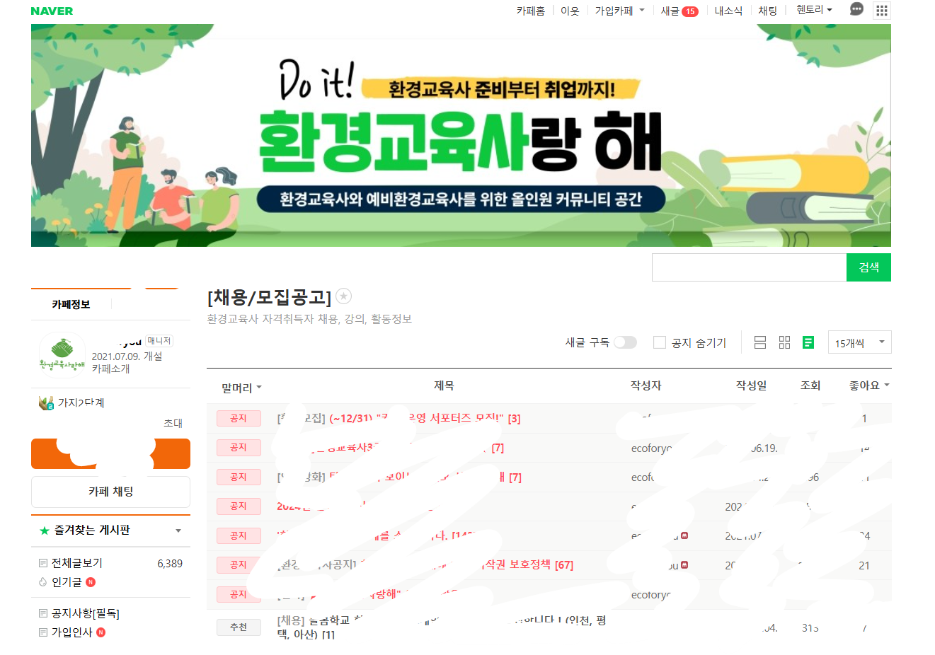 개인적으론 네이버카페에서 환경교육사 관련 정보를 가장 많이 얻을 수 있다고 생각되기에 해당 카페를 꼭 가입하시길 추천드립니다. 네이버에는 환경교육사나 환경 관련 직업을 찾는 사람들을 위한 카페와 커뮤니티가 활성화되어 있습니다. 여기에서는 환경교육사 강사나 관련 직무에 대한 채용 정보를 주고받을 수 있으며, 네트워크를 통해 다양한 기회를 얻을 수 있습니다.